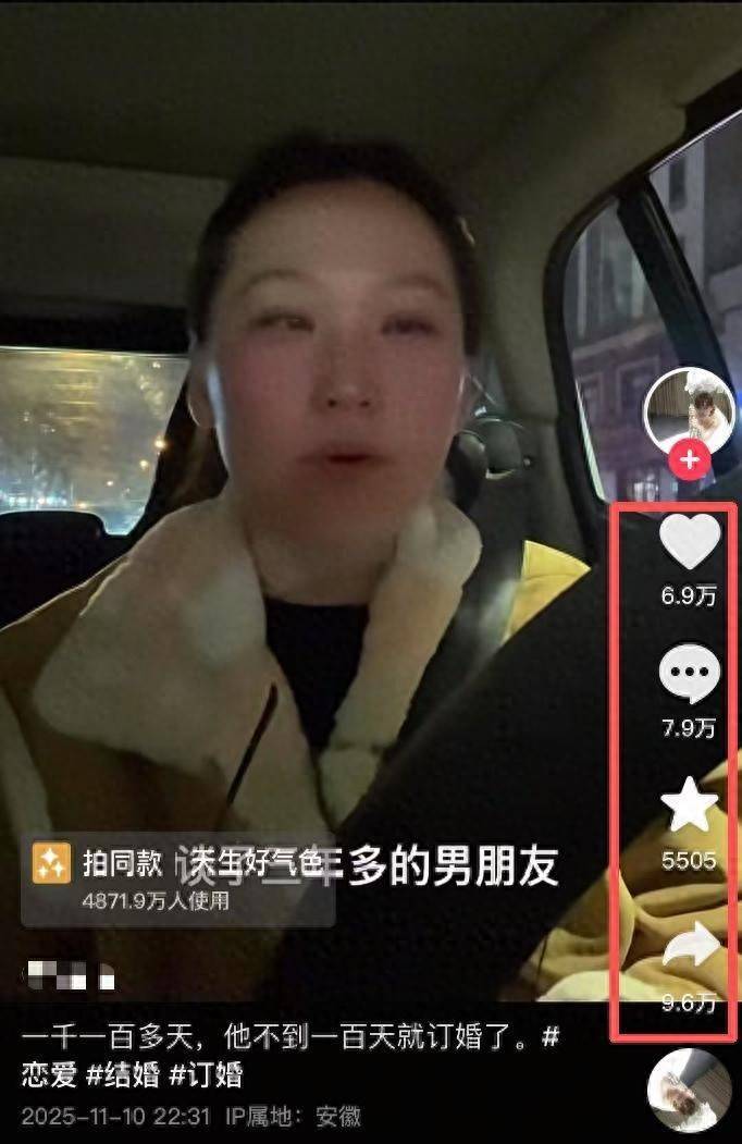 深夜的车里,一个姑娘红着眼眶哭到声音发颤,对着镜头念叨“三年恋爱,他分手不到百天就订婚”。